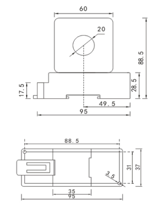 ● 外型尺寸(mm): 95(L)x37(W)x88.5(H),孔徑:20mm