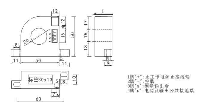 說明:該產(chǎn)品表示0~10A輸入量程、0~5V輸出、12V供電、B5外型的單相交流電流變送器