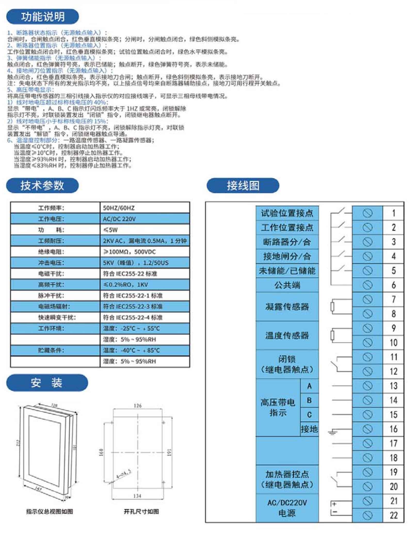 HDZC-1-TR開(kāi)關(guān)狀態(tài)綜合指示儀是針對(duì)目前中壓系統(tǒng)技術(shù)發(fā)展而開(kāi)發(fā)設(shè)計(jì)的一種多功能智能化開(kāi)關(guān)模擬綜合動(dòng)態(tài)指示裝置。產(chǎn)品集中指示實(shí)驗(yàn)位置、工作位置、斷路器狀態(tài)、接地刀狀態(tài)、操作機(jī)構(gòu)儲(chǔ)能狀態(tài);帶有高壓帶電指示及閉鎖控制、自動(dòng)加熱除濕等多種功能,簡(jiǎn)化了開(kāi)關(guān)柜面板設(shè)計(jì),美化了布局,是完善了開(kāi)關(guān)狀態(tài)指示功能和安全性能的新型電氣裝置。